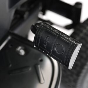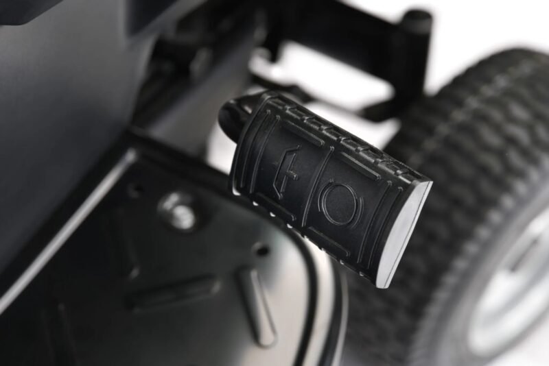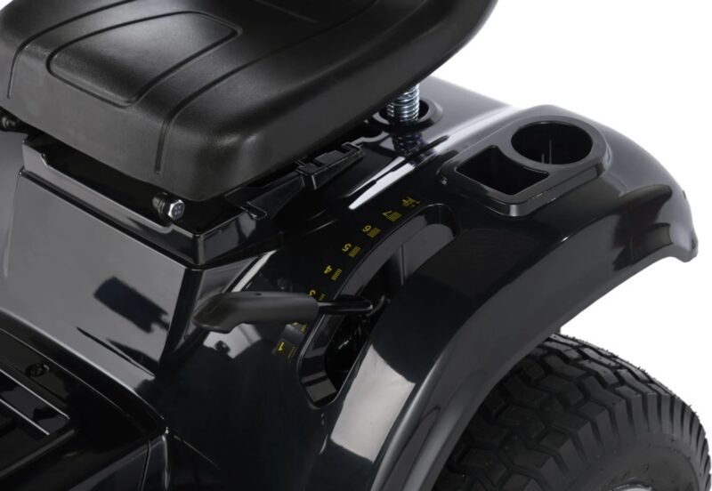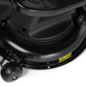 Das 98 cm breite Mähdeck mit zwei Messern wird über eine elektromagnetische Kupplung aktiviert und bietet 7 Schnitthöhen von 25 bis 80 mm. Tasträder verhindern dabei den Kontakt des Mähdecks mit dem Boden.