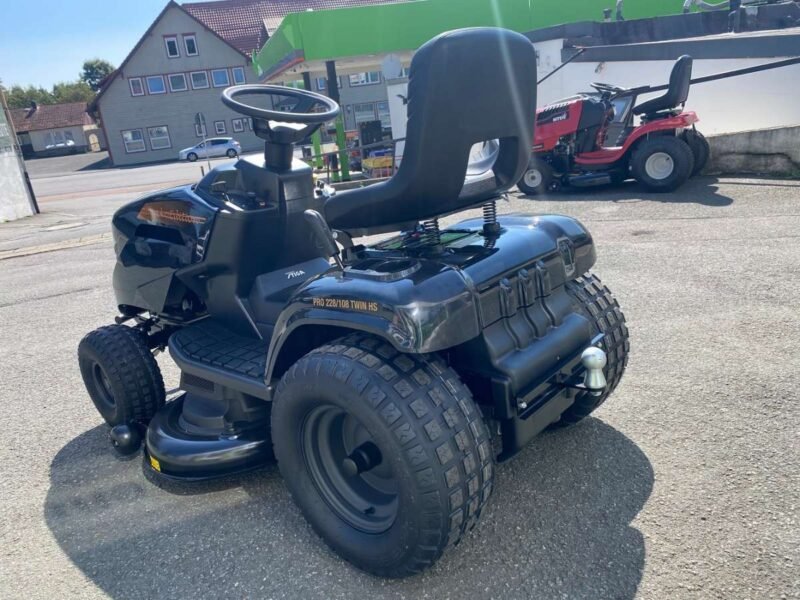 Der Black Edition Pro 228/108 HS ist ein leistungsstarker Rasentraktor mit einem 108 cm breiten Mähdeck, Seitenauswurf und Mulchfunktion. Angetrieben wird er von einem STIGA-Zweizylindermotor mit 552 cm³ Hubraum und etwa 20 PS, der sich ideal für größere Rasenflächen eignet.